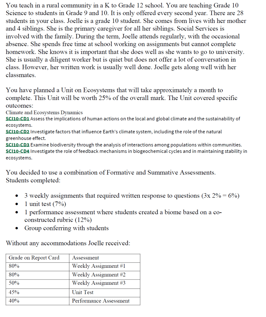 As discussed above I would give her a final mark of 75.95%. The unit cannot be dropped from her mark because we must assess her mastery of the four outcomes of the unit but the original assessment may not accurately reflect her mastery either when compared to her learning in class. Overall this is not a large change but hopefully it will motivate her to continue her efforts in class and make her feel her situation is being seen so she can bring up future issues as they arise.