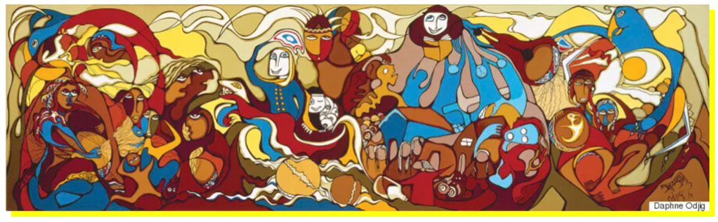 “The Indian in Transition” is a mural that was commissioned by the Canadian Museum of Civilization. It reflects the history of Indigenous people from before contact with Europeans, through centuries of colonization. A mythic Thunderbird watches history unfold from above.